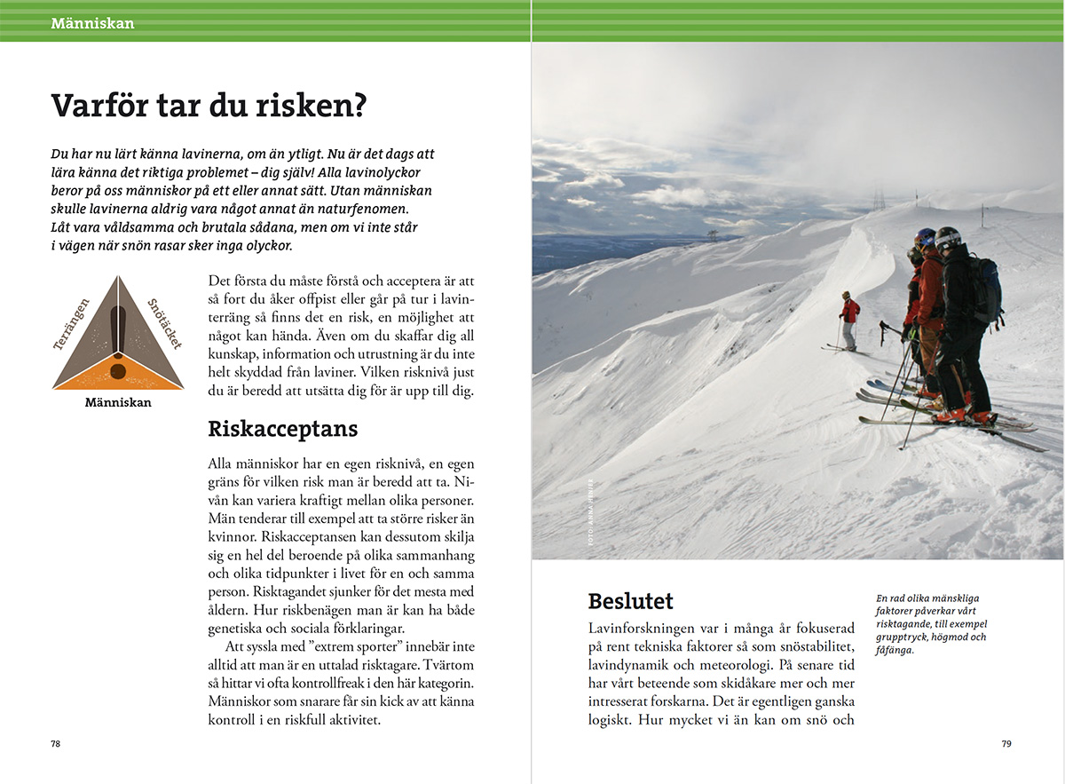 Steg för steg får du lära dig lavinriskbedömning, kamraträddning och hur du minskar riskerna uppför och utför. Ett helt kapitel ägnas åt riskbeteenden hos oss skidåkare, något som de senaste åren rönt ett allt större intresse bland lavinforskarna världen över.