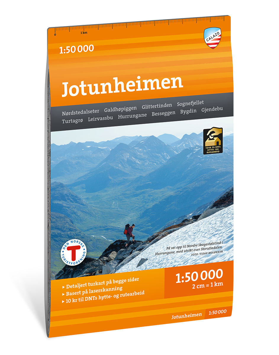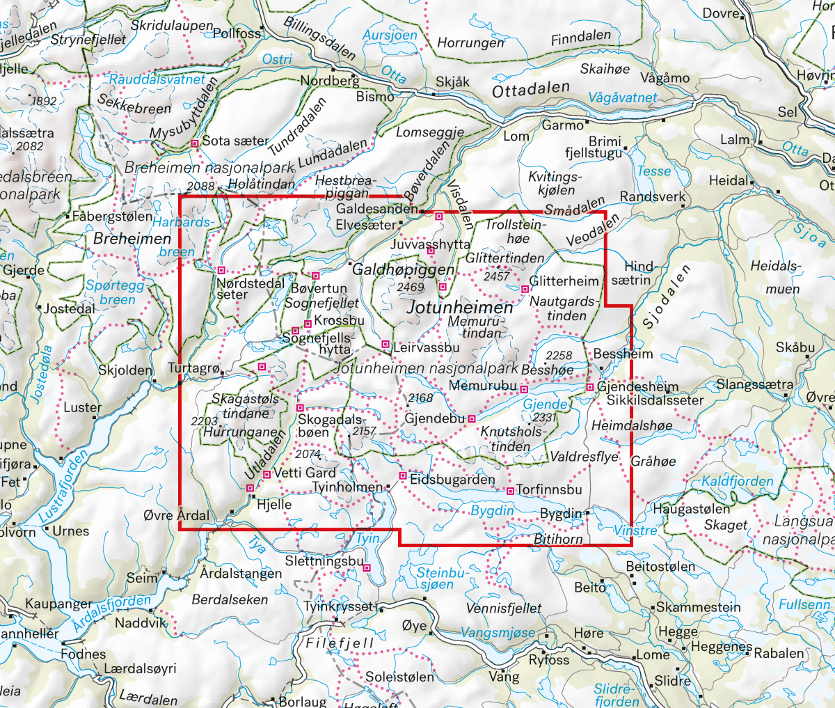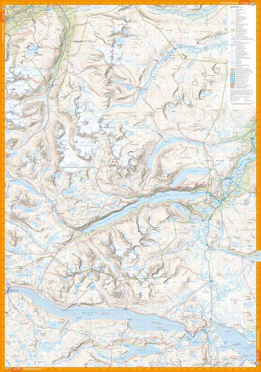 Jotunheimen bietet einige der beeindruckendsten Berglandschaften Norwegens, mit ikonischen Wanderzielen wie Hurrungane, Galdhøpiggen, Glittertind und Besseggen. Diese Karte enthält alle Hütten und markierten Wanderwege der Region und ist auch für den Wintereinsatz geeignet – mit eingezeichneten Winterrouten und präparierten Langlaufloipen.