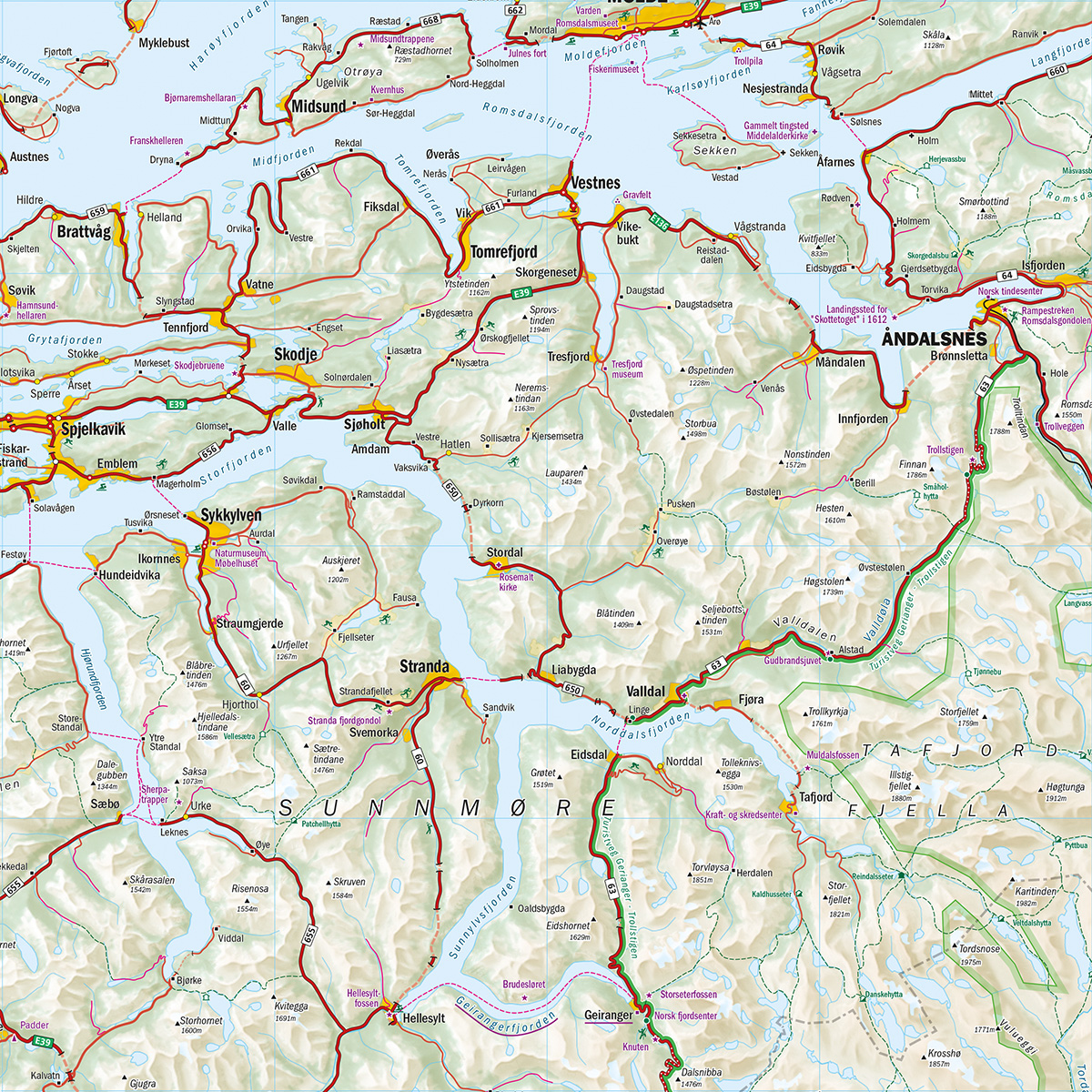 Entdecken Sie die schönsten Regionen Zentralnorwegens mit dieser neuen und aktualisierten Straßenkarte. Beliebte Reiseziele wie Trondheim, Ålesund, Geiranger und Rondane sind deutlich markiert, ebenso wie nationale Touristenstraßen und wichtige Sehenswürdigkeiten.