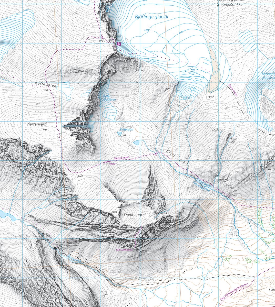 Dies ist eine einzigartige Karte mit einer noch nie dagewesenen Detailfülle von Schwedens höchstem Berg. Die Geländeinformationen in der Karte basieren auf luftgestütztem Laserscanning. Zum ersten Mal erscheinen Klippen, größere Felsen, Wälder und Bäche mit einer Genauigkeit, die wirklich der Realität entspricht. Die aktuelle Ausdehnung und Bruchzonen der Gletscher wurden in Zusammenarbeit mit der Abteilung für Naturgeographie der Universität Stockholm ermittelt. Eine Karte im Maßstab 1:15.000 bietet eine gute Unterstützung für alle, die Gipfeltouren, Gletscherwanderungen unternehmen oder auf andere Weise die markierten Wege der Täler verlassen und neue Routen in höheren Lagen ausprobieren.