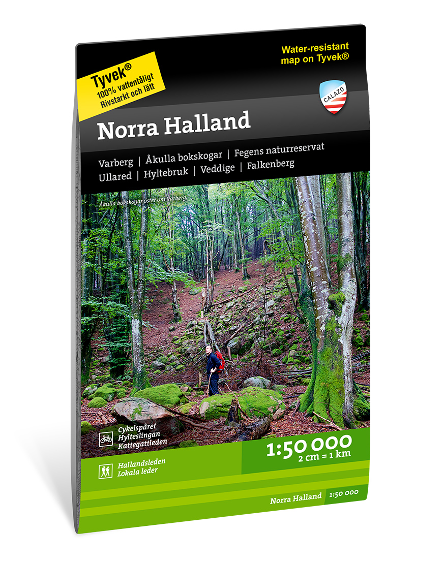 Wir haben zwei Karten von Halland mit Fokus auf das Leben im Freien entwickelt. Zusätzlich zu aktualisierten Informationen über die aktuelle Route des Hallandsleden und den Kattegattleden-Radweg haben wir eine Reihe lokaler Wanderwege hinzugefügt. Dieses Nordblatt umfasst das Gebiet nördlich von Falkenberg mit Varberg, Hyltebruk und Veddige. Wir drucken unsere Karten immer auf einem Material namens Tyvek. Sie besteht aus einer Kunstfaser, die die Karte absolut wasserunempfindlich und sehr reißfest macht. Eine Tyvek-Karte reißt nicht in den Falten und verliert auch nicht ihre Farbe, wenn Sie sie verwenden.