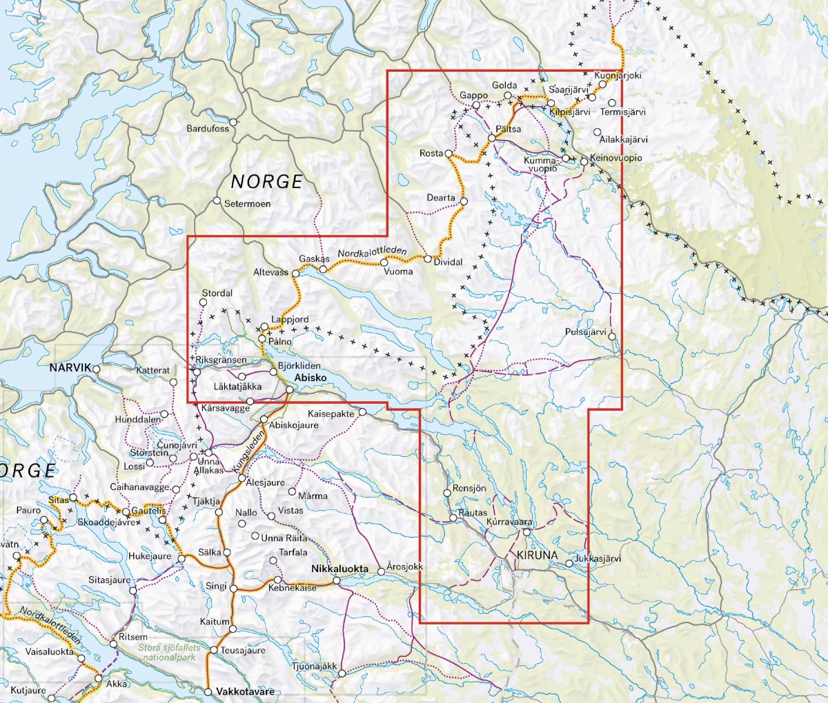 Diese Karte deckt das Berggebiet nördlich von Kiruna und Abisko bis nach Treriksröset ab. Die Karte enthält große Gebiete auf beiden Seiten der Landesgrenze zwischen Schweden und Norwegen und ist perfekt für diejenigen, die den Nordkalottleden zwischen Abisko und Kilpisjärvi wandern oder den Nationalpark Vadvetjåkka besuchen möchten. Wenn Sie auf dem Gröna-Band wandern und von Sälen aus der gesamten Bergkette nördlich gefolgt sind, ist dies die allerletzte Karte, die Sie aus dem Rucksack nehmen.