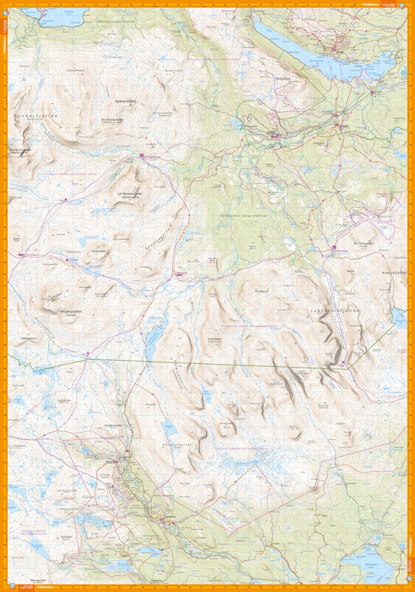 Diese Karte ist eine der Karten, die wir die Bergkarte der neuen Generation nennen. Dies bedeutet eine Fülle von Details, die in anderen Karten desselben Gebiets nicht zu finden sind. Die Geländeinformationen basieren auf luftgestütztem Laserscanning. Neben völlig neuen Höhenkurven im äquidistanten 10-Meter-Abstand werden unter anderem Wasserläufe und Hänge deutlich besser dargestellt als bisher. Die Wege werden genauer wiedergegeben, ebenso wie Dolinen, Gebäude, felsiger Boden und schwer zugängliche Vegetation. Großer Abschnitt über Vålådalen, Lunndörrsfjällen und Ljungdalen auf der einen Seite und Anarisfjällen und Oviksfjällen auf der anderen Seite. Wir sind zu dem Schluss gekommen, dass Tyvek® das beste Material für eine Karte ist. Sie besteht aus einer Kunstfaser, die die Karte absolut wasserunempfindlich und sehr reißfest macht. Eine Tyvek-Karte reißt nicht in den Falten und verliert auch nicht ihre Farbe, wenn Sie sie verwenden.